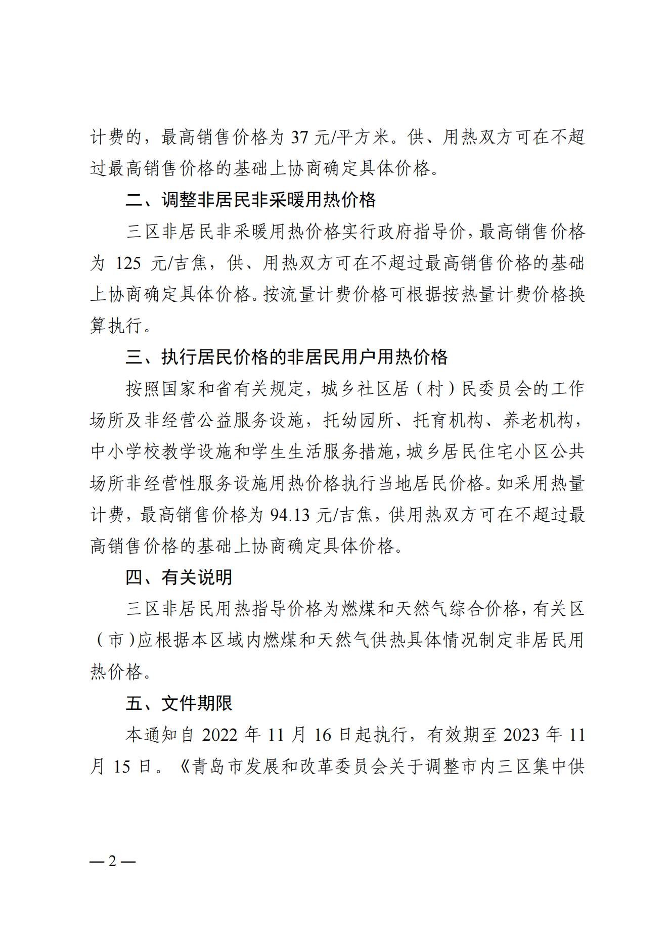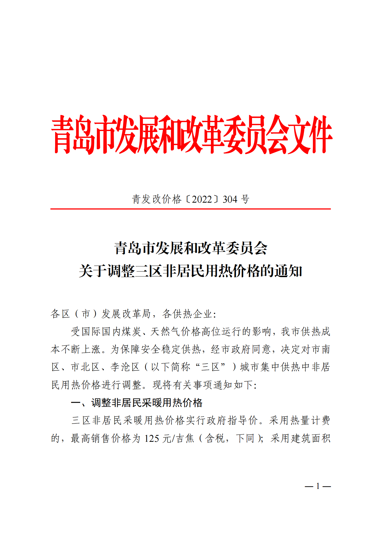 青發(fā)改價(jià)格【2022】304號(hào) 青島市發(fā)展和改革委員會(huì) 關(guān)于調(diào)整三區(qū)非居民用熱價(jià)格的通知