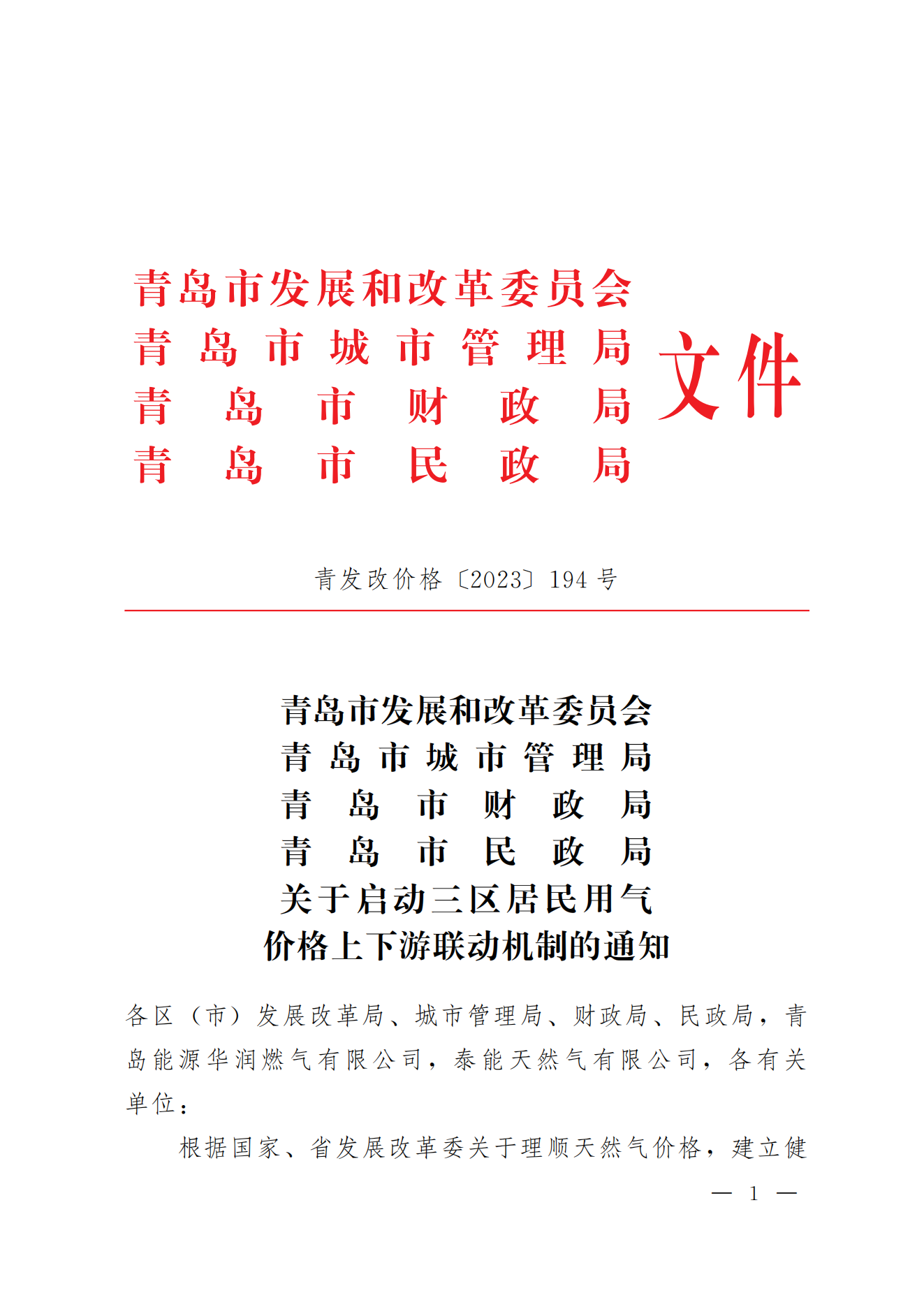青發(fā)改價(jià)格〔2023〕194號(hào)《青島市發(fā)展和改革委員會(huì) 青島市城市管理局 青島市財(cái)政局 青島市民政局 關(guān)于啟動(dòng)三區(qū)居民用氣價(jià)格上下游聯(lián)動(dòng)機(jī)制的通知》.pdf