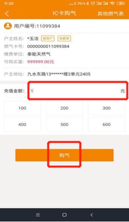 2、輸入您需要購買的金額,并點擊“購氣”。